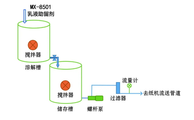 3、搅拌30分钟以上,经流量泵、过滤器连续加入抄纸系统中。